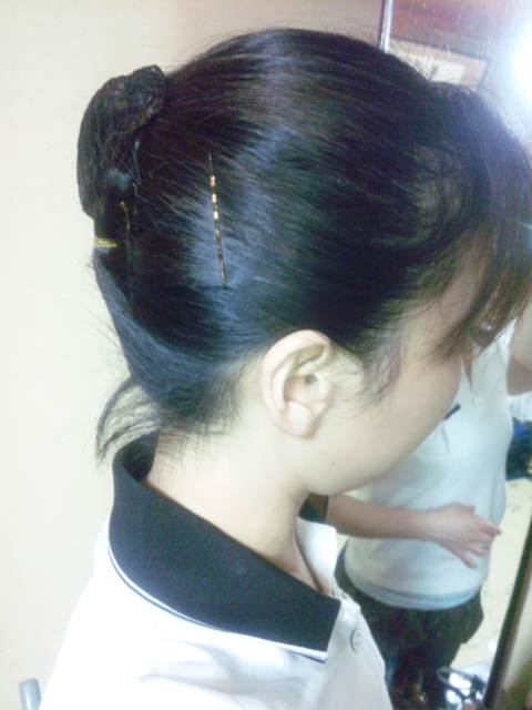 固めずにこれくらい出来れば、襟足を隠す髪型や髪飾りにすれば、おだんごキャップのヘアスタイルでいけるかな(^_^;)