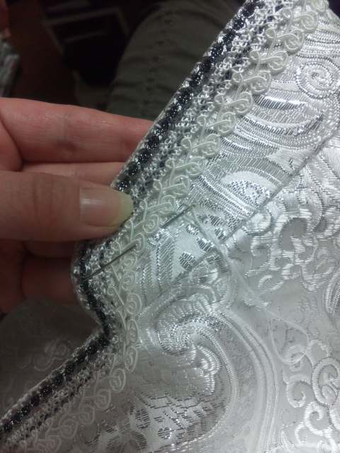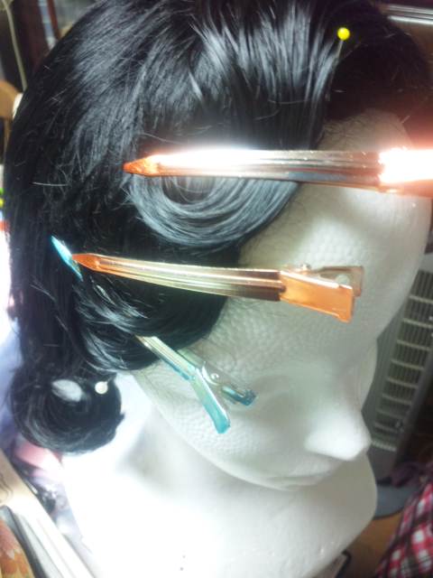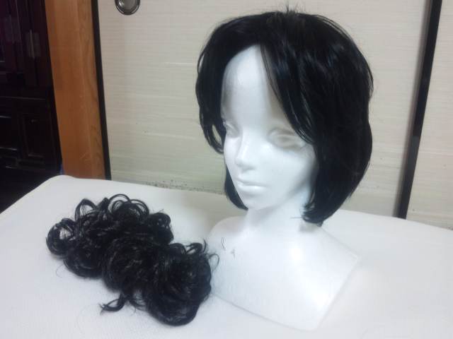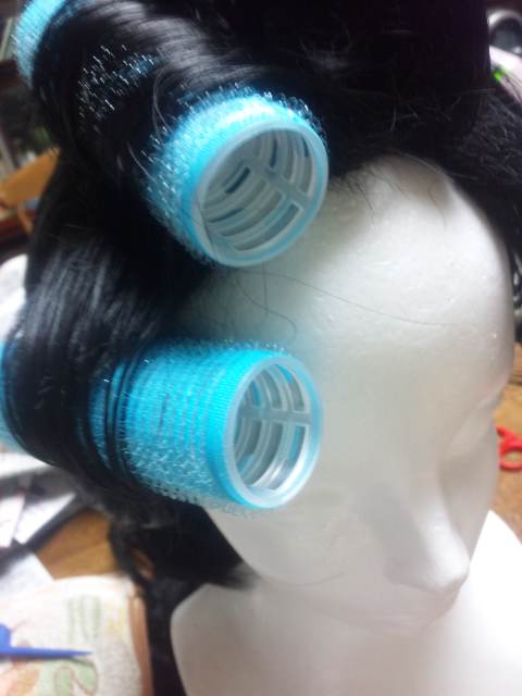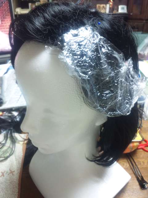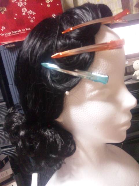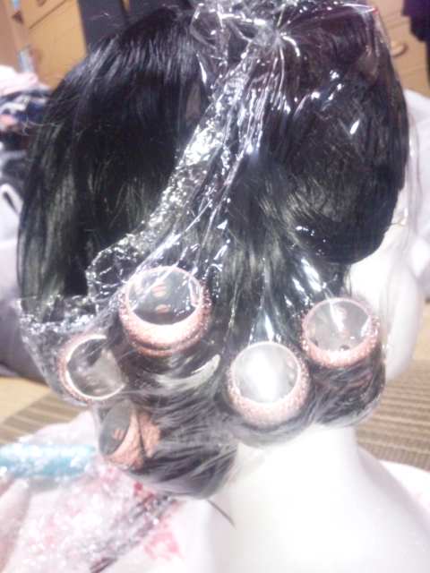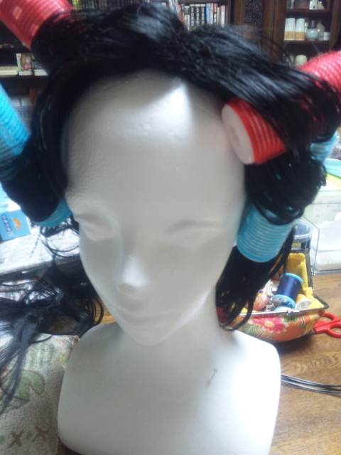 裾は編み込んで、シュシュウィッグを縫い付けようと思ったんだけど、カツラが思ってたより短いので、今日、とりあえず巻いてみて数ヵ所くくりました。
