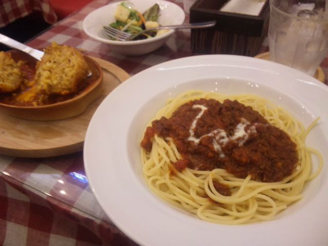ランチセットは、サラダとドリンク、松坂牛のライスコロッケ、松坂牛のミートソースパスタ♪♪