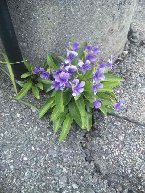 通勤路の電柱の裾に健気に咲いていたスミレ。