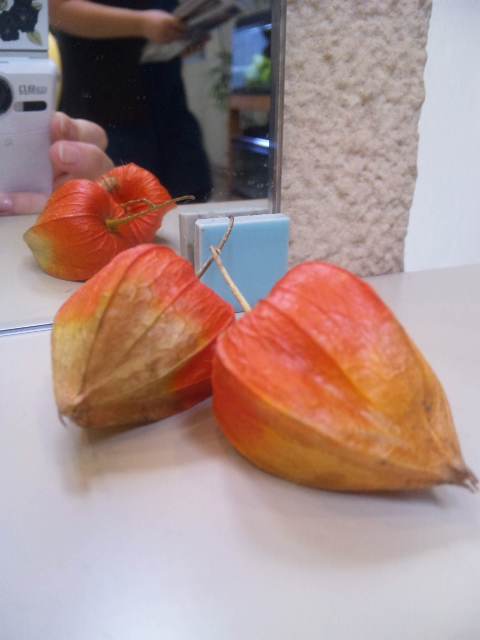 店ではワンコがテコテコ歩いてて、今日は鏡の前にホオズキが(*^^)