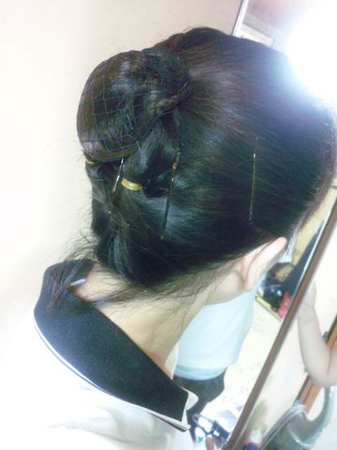 固めずにこれくらい出来れば、襟足を隠す髪型や髪飾りにすれば、おだんごキャップのヘアスタイルでいけるかな(^_^;)